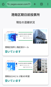 港南区役所の期日前投票における混雑状況は、下記リンクより確認できますが、会場と駐車場の混雑状況が違うため、リンク先に駐車場の混雑状況を確認できるよう改善していただきました。 pages.vacan.com/fff877d9477243