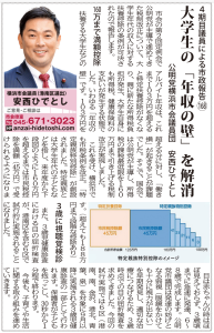 タウンニュース港南区版に【市政報告No168 】が掲載されました。 ◆大学生の「年収の壁」を解消 市会の第2回定例会で公明党が主導で進めてきた税制改正について、大学生年代の収入に対する扶養控除の条例が可決されたので報告します。 『160万まで満額控除』 扶養する大学生などのアルバイト年収は、これまで103万円を超えると特定扶養控除がなくなり、親に新たな所得税負担が発生、大学生自身にも所得税、健康保険料の支払いが発生する状態でした。いわゆる「年収の壁」です。103万円を超える分に対し、「働き損」が起きることが課題でした。そこで、国会では公明党が主導し、所得税の課税最低限を160万円まで引き上げる税制改正が実現しました。 これを受け、横浜市でも市税条例を改正。「特定親族特別控除」が創設されました。特定親族とは大学生年代の子どもなどを指し、来年度から下段図のように160万円を超えるまでは市民税控除を満額(45万円)で受けられるようになります。(超えても188万円まで段階な控除あり) 『3歳に視聴覚検診』 また、3歳児健康診査における目の屈折検査が、港南区を含む6区で試行的に実施されることになりました。 www.townnews.co.jp/0112/2025/08/28/799508.html