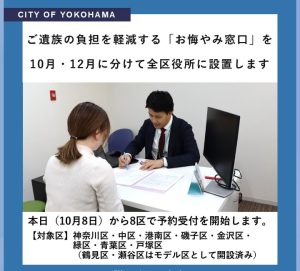 お亡くなりになった方の区役所での手続について、御遺族の負担軽減を図るため、「お悔やみ窓口」を10月、12月に分けて全区役所に設置します。 お悔やみ窓口では、事前予約の際にお伺いした情報をもとに、必要なお手続をお調べし、来庁当日は、お悔やみ窓口にて申請書の作成のお手伝いをしたり、必要なお手続の一覧表を作成し、担当窓口を御案内します(一部お手続については、お悔やみ窓口で完結します)。 亡くなられた方がどんな行政サービスを受けていたかわからない、何の手続から手をつければいいのかわからない等、お悔やみ窓口にて御案内させていただきます。 www.city.yokohama.lg.jp/kurashi/koseki-zei-hoken/todokede/kojo/okuyamimadoguchi.html