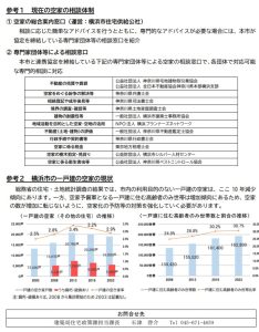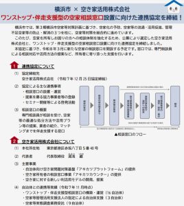 横浜市×空き家活用株式会社 ワンストップ・伴走支援型の空家相談窓口設置に向けた連携協定を締結!(記者発表より抜粋) 横浜市では、第3期横浜市空家等対策計画に基づき、空家化の予防、空家等の流通・活用促進、管理不足空家等の防止・解消の3つを柱に、空家等対策を総合的に進めています。 このたび、空家を所有しお困りの方への相談体制を強化するため、公募により選定した空き家活用株式会社と、ワンストップ・伴走支援型の空家相談窓口設置に向けた連携協定を締結しました。 本協定に基づき、令和8年3月に新たな空家の相談窓口を開設する予定です。 窓口では、専門相談員による相談対応や活用方法の提案など、所有者に寄り添った支援を行います。 www.city.yokohama.lg.jp/city-info/koho-kocho/press/kenchiku/2025/1225kyouteiteiketsu.html