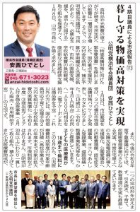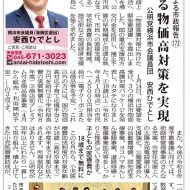 ◆暮らし守る物価高対策を実現! 食料品や光熱費の値上がりが続き、市民生活への影響は一層深刻さを増しています。そこで、公明党横浜市議団は、市民の声より「今、必要な支援を、速やかに届ける」取り組みを推進すべく、1月8日、山中市長に「物価高騰対策に向けた緊急要望書」を提出しました。 国の重点支援地方交付金を活用し、補正予算の早期編成と迅速な執行、市民への直接支援、学校給食費の負担軽減、商店街など地域経済支援を強く求めました。 1月14日、市は要望を受け、3つの横浜市物価高騰対策パッケージを発表し、カタチになりました。 ①19歳以上(令和8年4月1日時点)の市民へ一人5,000円相当を給付(電子クーポンまたは商品券を予定)。 これ以外の方には、国の物価高対応子育て応援手当2万円を給付 ②小学校給食費の実質無償化(令和8年度) ③商店街プレミアム付き商品券事業(4月から販売・利用開始予定) の3点です。  また、今後の令和8年度予算審議に向けては、街路樹管理事業のさらなる充実、市営住宅屋上への太陽光発電設備の導入支援強化、公園愛護会への活動費増額、認知症支援事業、ヨコハマあんしん登録事業、道路修繕・整備事業拡充等をしっかりと推進していきます。